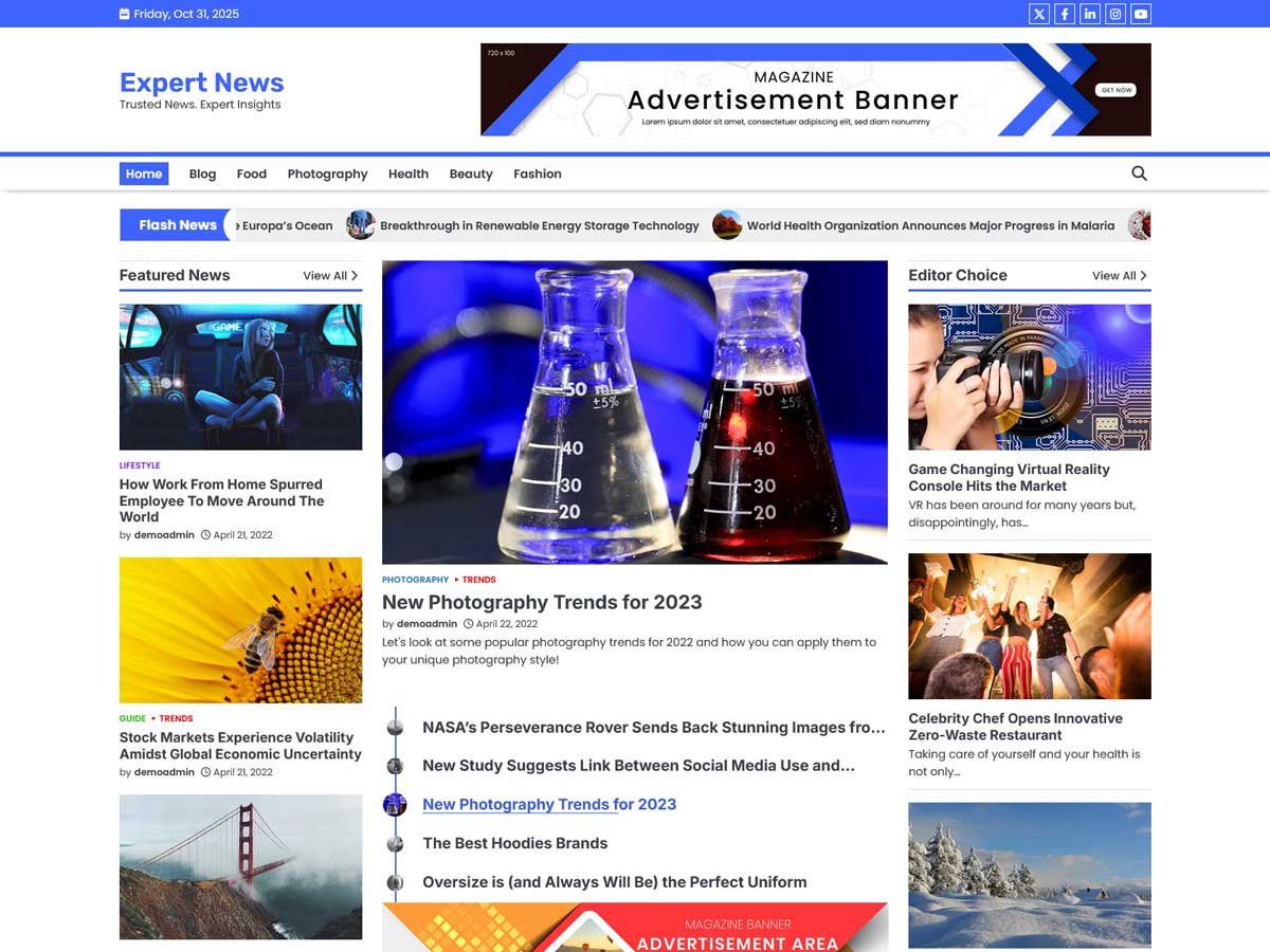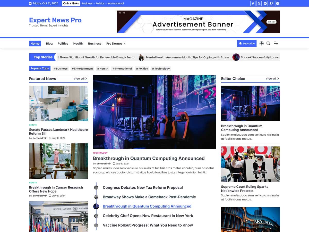 Expert News Pro is a sleek and modern WordPress theme built for news websites, online magazines, and content portals. Featuring a minimalist design and intuitive layout, it offers a variety of flexible layout options, customizable color settings, and widget-ready areas for easy personalization. The theme is optimized for speed and SEO, ensuring fast load times and improved search engine rankings. With a fully responsive design, Expert News Pro delivers a seamless browsing experience on all devices and browsers, making it ideal for bloggers, journalists, and content-focused publishers.